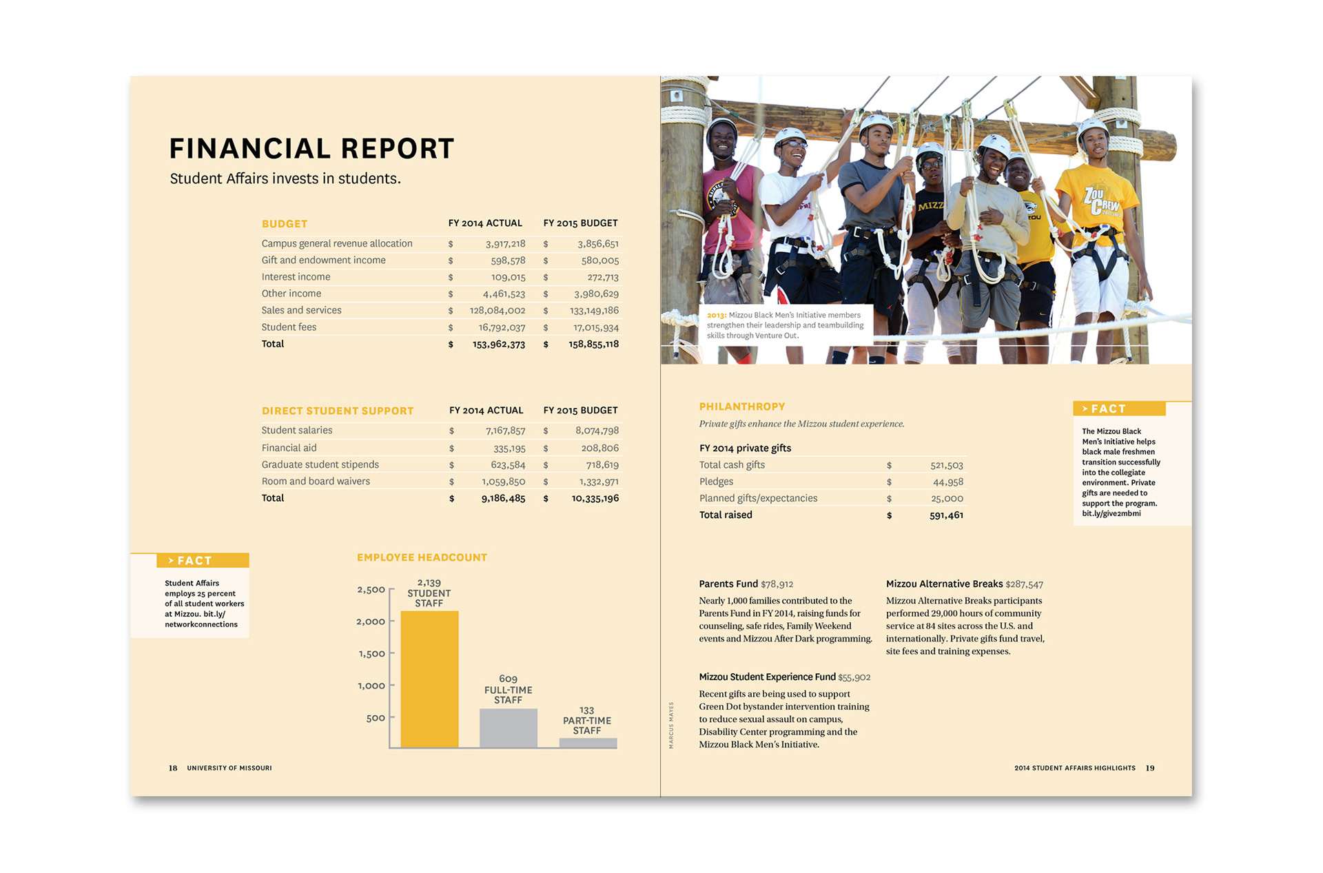 Mizzou's student life services are huge and diverse, far beyond anything I experienced at a smaller university. This annual report features recent highlights alongside historical milestones dating back to the 1800's. There were too many great archival photos to fit — the hardest part was selecting which ones to use!